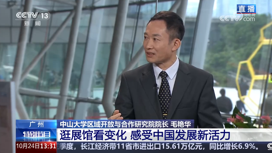 2025年10月24日,毛艳华院长做客CCTV13《新闻直播间》第138届广交会节目《广交天下客》,围绕中国制造绿色转型与出口国际竞争力进行专访解读。毛艳华院长在节目中表示,本届广交会上大量的名优产品和“新三样”出口产品代表了“中国制造”绿色转型的方向,“绿色发展”理念助力出口产品海外市场竞争力。