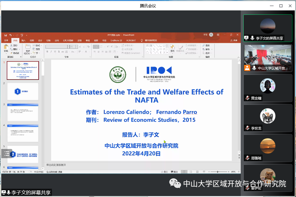 2022年4月20日晚18:30-20:30,中山大学区域开放与合作研究院学习讨论会议以线上和线下相结合的方式成功举行。本次学习讨论会由李子文博士分享文献《Estimates of the Trade and Welfare Effects of NAFTA》,该文于2015年发表在《Review of Economic Studies》期刊上。参加学习讨论会人员包括毛艳华教授、李兵副教授、副研究员、博士后以及博士生和硕士生等,另有澳门科技大学、澳门城市大学博士生通过线上形式参与了本次学习讨论会。