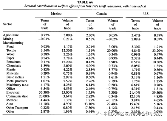 3.NAFTA关税降低和贸易赤字对福利影响的部门贡献