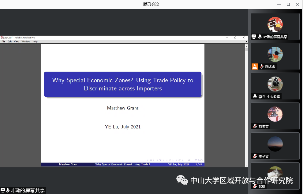 2021年7月13日晚19:00-20:40,中山大学区域开放与合作研究院文献研读会议以线上方式成功举行。本次学习讨论会由叶璐博士分享文献。参加学习讨论会人员包括毛艳华教授、李兵副教授、副研究员、博士后以及博士生和硕士生等,另有澳门科技大学、澳门城市大学博士生通过线上形式参与了本次学习讨论会。
