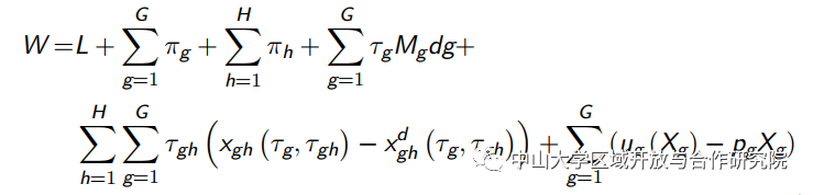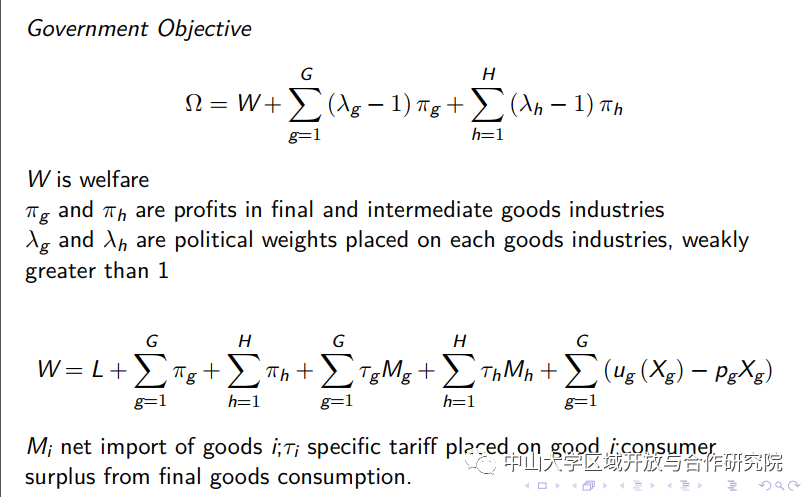 以Grossman和Helpmen(1994)为基础进行扩展,增加中间品和最终品从而获得最优统一关税的基础理论模型。其中政府目标函数的后两项是政府获得厂商“游说”的收益。社会福利函数与Grossman和Helpmen(1994)的文章一致。