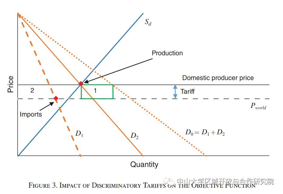 在关税其实的时候,D1没有关税,D2有关税,那么生产者剩余的面积是相同的,但是关税收入(方形1)是小于消费者剩余(梯形2)的。