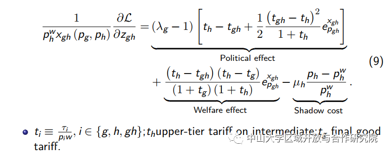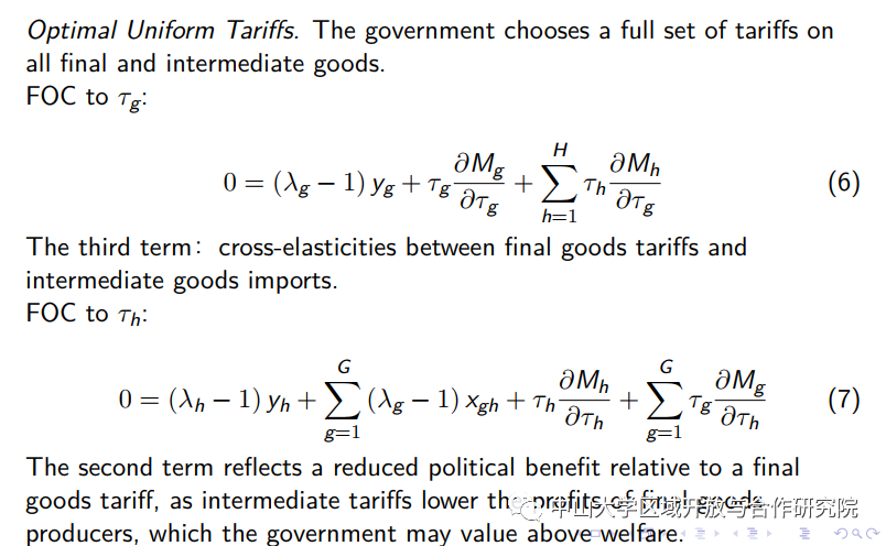 通过FOC可以获得最优统一关税模型的结果,与Grossman和Helpmen(1994)的FOC结果相比,(6)增加了最终品关税和中间品进口的交叉弹性。(7)增加了最终品政策强度和中间品关税和最终品进口的交叉弹性。
