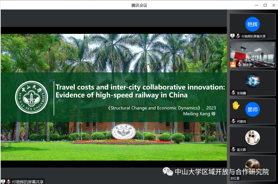 2023年5月9日晚19:00—20:00,中山大学区域开放与合作研究院学习讨论会以线上的方式成功举行。本次学习讨论会由付艳辉硕士生分享文献《Travel costs and inter-city collaborative innovation: Evidence of high-speed railway in China》。参加学习讨论会人员包括毛艳华教授、荣建欣副研究员、各位博士后、博士生和硕士生等,另有澳门科技大学、澳门城市大学博士生通过线上形式参与了本次学习讨论会。