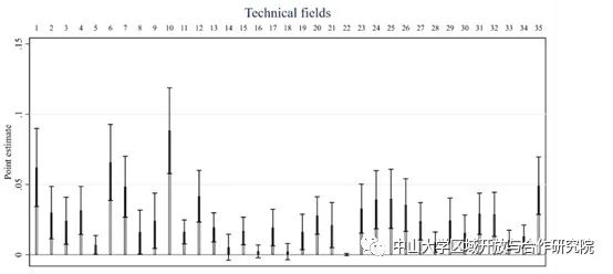根据WIPO,基于IPC-8可将专利分为35类;基于IPC-1可将专利分为8个领域。除有机精细化学、制药、食品化学以及微结构和纳米技术之外,在大多数领域,高铁间接连接对协同专利都有积极影响。这四个领域都是化学领域,他们的材料很难通过高铁运输,因此高铁间接连接影响很小。此外,电机仪器和能源,计算机技术,测量领域的协同专利受到的积极影响最大。
