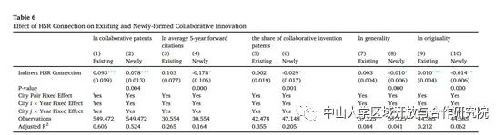 对于现有的合作,当因变量为 5年引用数的对数、发明占比或一般性时,间接高铁连接的系数呈不显著正相关。然而,当因变量变为原创性时,该系数变为显著正相关。这些结果表明,间接连接主要有助于现有合作引用更多区域的专利,获得更复杂的技术。然而,在新形成的合作关系中,情况则完全不同。表6列表明,基准回归高铁间接连接的负系数主要是由对新形成协作的影响驱动的。