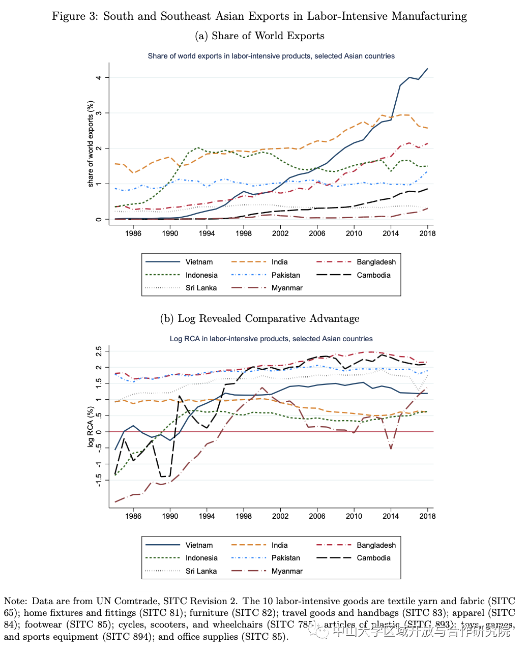 从比较优势来看,孟加拉国、柬埔寨和越南在劳动密集型产品中的RCA显著增加,且集中于出口服装、鞋类等。相比之下,印度在这些产品中的RCA不断下降,而巴基斯坦的基本持平。