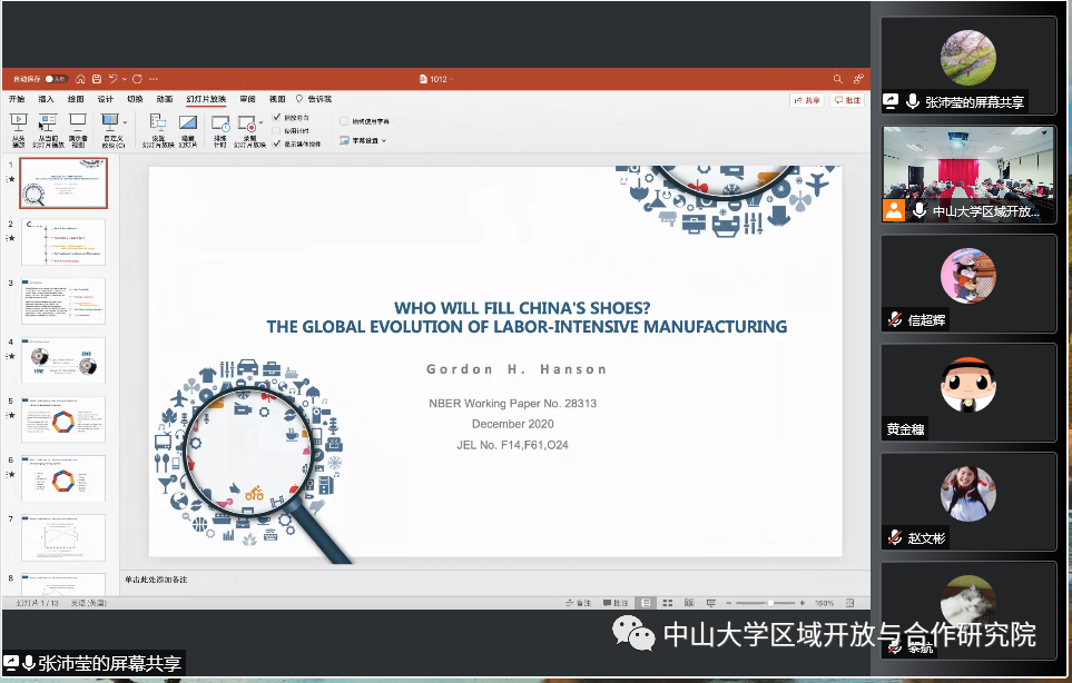 2021年10月12日晚18:30-20:00,中山大学区域开放与合作研究院文献研读会议以线上线下结合的方式成功举行。本次学习讨论会由张沛莹同学分享文献<Who Will Fill China's Shoes? The Global Evolution of Labor-Intensive Manufacturing>。参加学习讨论会人员包括毛艳华教授、李兵副教授、副研究员、博士后以及博士生和硕士生等,另有澳门科技大学、澳门城市大学博士生通过线上形式参与了本次学习讨论会。