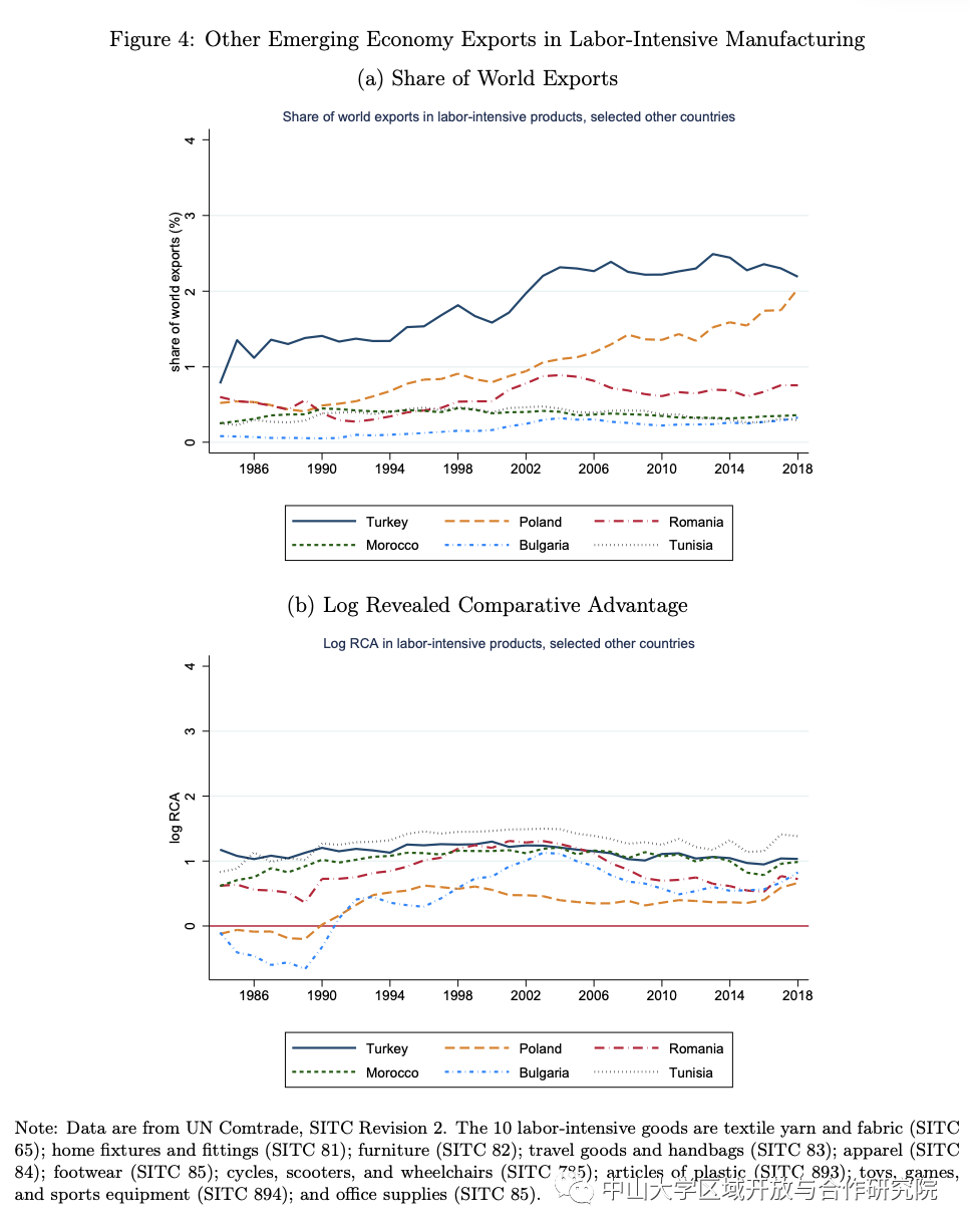 从全球份额来看,这6个国家合计占全球劳动密集型制造业出口的份额在1984年为2.5%,2001年为4.4%,2018年为6%。其中,只有波兰的全球出口份额最近出现了强劲增长。主要集中在家具(2018年占全球出口的6.1%)、塑料制品(2018年占全球出口的3.1%)、玩具和游戏(2018年占全球出口的2.3%)等。土耳其作为6个国家中最大的出口国,其出口份额在过去二十年中一直持平。