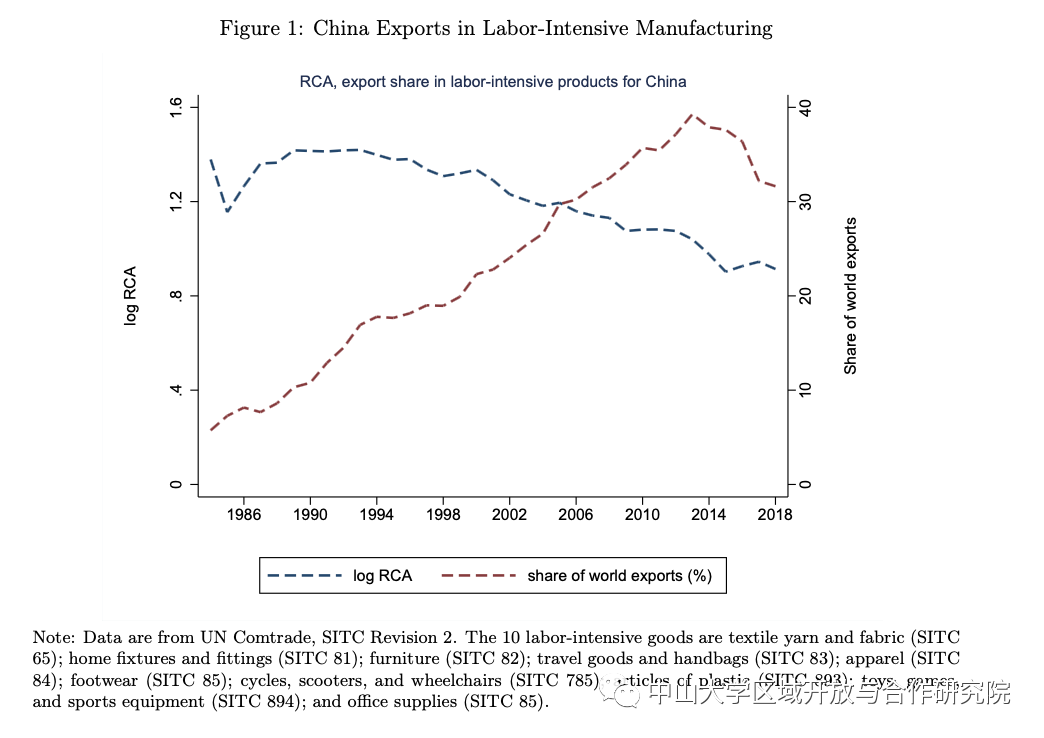 从比较优势看,中国在其出口导向型发展的早期在劳动密集型商品方面显示出强大的比较优势,随着时间的推移,这一优势稳步下降。