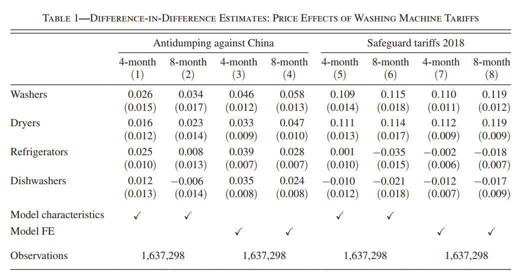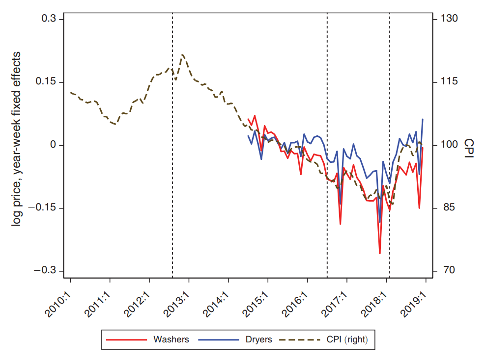 本文估计了美国进口限制对洗衣机的价格影响。在2012年和2016年对韩国和中国征收反倾销税的同时,价格出现了下调或小幅波动,同时生产转移到了其他出口平台国家。 加上2018年的关税,几乎所有来源国的洗衣机价格都上涨了近12%。 有趣的是,这种不受关税限制的干衣机的价格也出现了同样幅度的增长。 将干衣机价格和国内品牌价格上涨因素考虑在内,2018年洗衣机关税意味着消费者价格的关税弹性超过1。