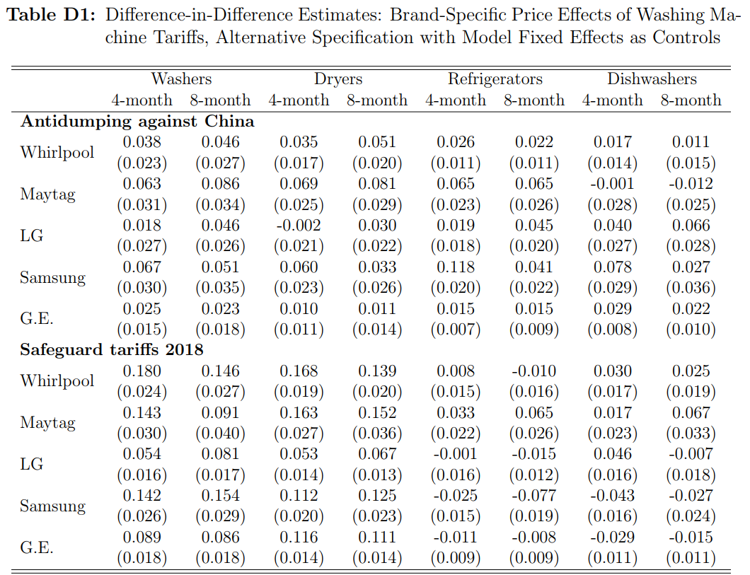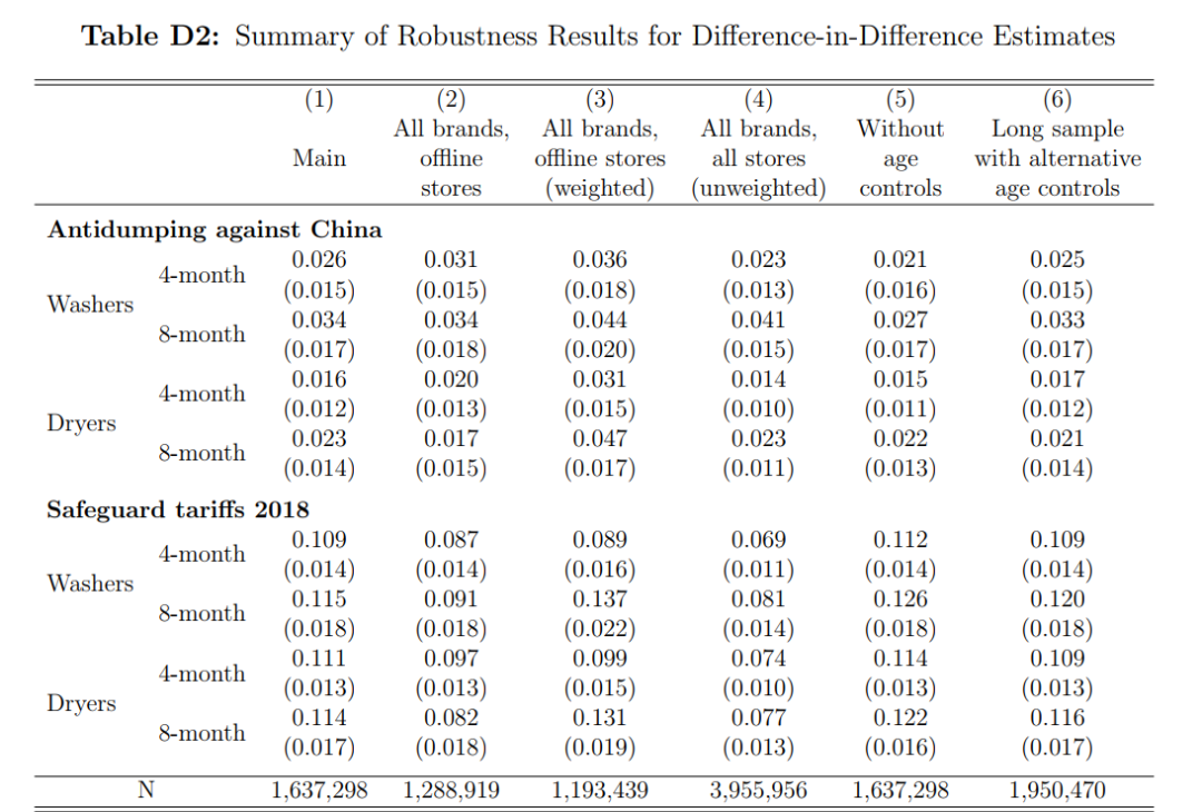 本文的结果对这些替代假设是稳健的。 集中于有关保障关税的结果,可以看到价格变化的最小估计来自样本,包括所有品牌和零售商,洗衣机和干衣机的8个月价格增长估计为8%。 本文对价格变化的最大估计来自仅限于实体店的加权样本,洗衣机和干衣机八个月的价格涨幅估计为13%。