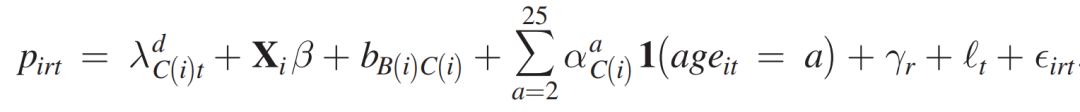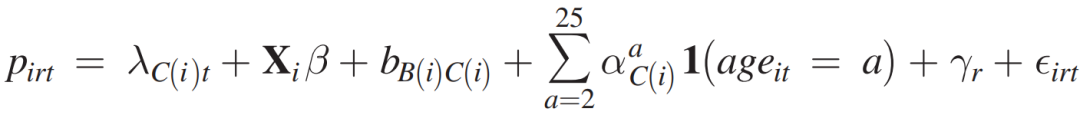 其中i代表型号,r代表零售商,t代表时间(以周为单位),C(i)指代产品类别,B(i)代表品牌,Xi包含总容量、能耗等级、智能设备和负载类型等特征,λC(i)t代表产品类别每周的固定效应,bB(i)C(i) 代表品牌和产品类别每周的固定效应,γr 代表零售商的固定效应,ageit代表以月为单位衡量的产品寿命。