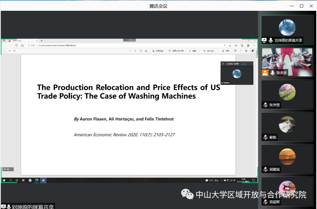 2021年9月14日晚18:40-20:50,中山大学区域开放与合作研究院文献研读会议以线上线下结合的方式成功举行。本次学习讨论会由刘坤原同学分享文献。参加学习讨论会人员包括毛艳华教授、李兵副教授、副研究员、博士后以及博士生和硕士生等,另有澳门科技大学、澳门城市大学博士生通过线上形式参与了本次学习讨论会。