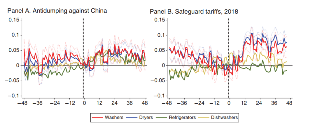 面板A反映了2016年中国反倾销税之前和之后的洗衣机、干衣机、冰箱和洗碗机类别的的估计值。 面板B报告了第201条保障关税的同等估计。 作者将冰箱和洗碗机纳入分析,以检验估计的合理性。 虽然洗衣机和干衣机的模式在B图中特别引人注目,但本文报告了在政策日期前48周的估计,以说明这些估计中任何趋势前期的影响。 例如,从2016年7月前后的幅度来看,冰箱价格的增长似乎存在差异;在很长一段时间里,洗衣机价格下跌的幅度超过了干衣机和其他电器。尽管图中明显的模式提供了信息,但必须考虑不同的趋势,以得出关税变化对价格的真实影响,由此计算了相对于进口限制前价格变化的进口限制后的估计价格变化。具体来说,将关税/反倾销事件的四个月影响计算为