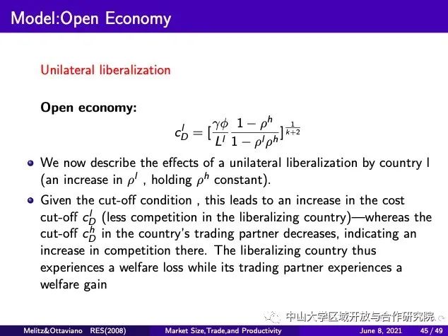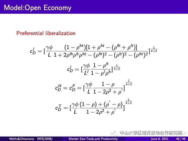 使用开放经济模型作者分析了双边自由化、单边自由化以及优惠自由化情形下的市场与企业特征。