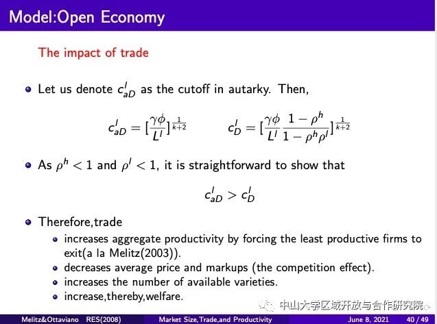 经过模型分析,可以得出贸易的影响。贸易会迫使生产率低的企业退出市场,使得总生产率提高;其次贸易促使竞争加剧,使得市场中的平均价格和加成降低;最后,贸易增加了产品种类数量进而使得福利上升。