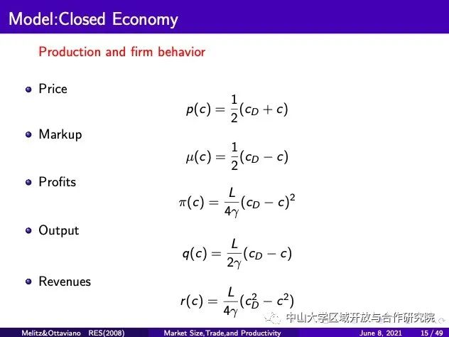 在开放经济条件下,与封闭经济相比,不同的地方是加入了冰山成本,两个国家的市场规模及贸易壁垒不同。同时企业在国内和国外两个市场分别进行利润最大化的决策。