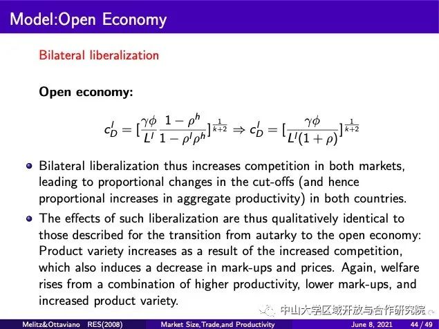 接着,通过自由进入的条件,来决定临界成本的大小。在封闭经济条件下,得到的结论是:市场规模对企业在均衡时的分布及表现方式有重大影响。市场规模越大,则表明产品种类越多,拥有更高生产率的企业(这些企业有较低的加价,因而有较低的价格)。企业越大(表现在产出和规模上),则获得的利润越高(虽然平均加成较低),但其面临的进入生还后生存的可能性越小。