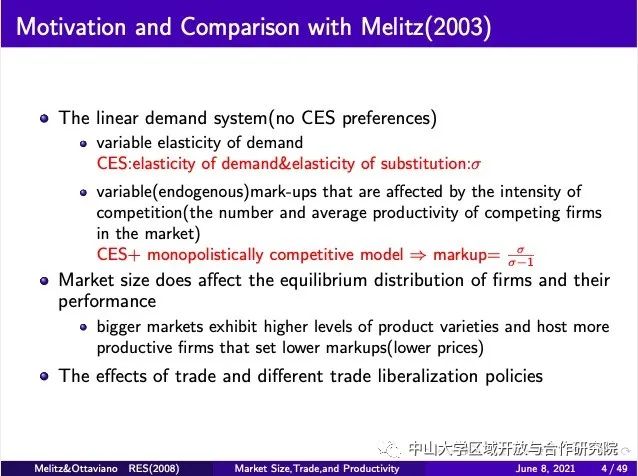 2021年6月8日晚19:00-21:50,中山大学区域开发与合作研究院文献研读会议以线上方式成功举行。本次学习讨论会内容包括中央财经大学范夏阳同学分享文献《Market Size, Trade, and Productivity》以及香港科技大学刘思勤同学个人论文的相关介绍。参加学习讨论会人员包括毛艳华教授、李兵副教授、副研究员、博士后以及博士生和硕士生等,另有澳门科技大学、澳门城市大学博士生通过线上形式参与了本次学习讨论会。