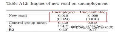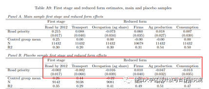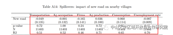 如果劳动力发生变化,那么文章很难去解释农业或者非农业就业者的变动。表A12显示,道路不会对未就业和未识别出的就业的成人产生影响,所以这种由于劳动力变化带来的潜在偏误也是不成立的。