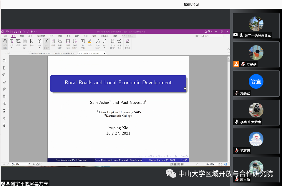 2021年7月29日晚19:00-20:30,中山大学区域开放与合作研究院文献研读会议以线上方式成功举行。本次学习讨论会由谢宇平博士分享文献。参加学习讨论会人员包括毛艳华教授、李兵副教授、副研究员、博士后以及博士生和硕士生等,另有澳门科技大学、澳门城市大学博士生通过线上形式参与了本次学习讨论会。