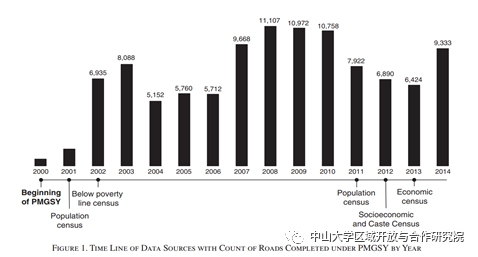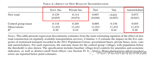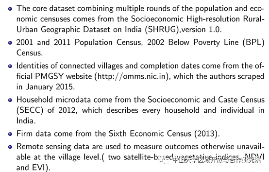 这篇文章的贡献就在于通过断点回归的方法结合了印度政府在实行村村通公路政策中的特殊设计,解决了道路修建过程中的政策非随机性,同时利用印度政府持续长达十多年的投资,发掘了大量村级层面的样本。