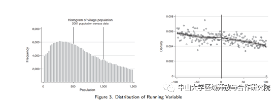 其次,作者在图3中也没有发现村庄人口在临界值附近有被操纵从而导致人为获取筑路机会的证据,人口的分布也是连续的。