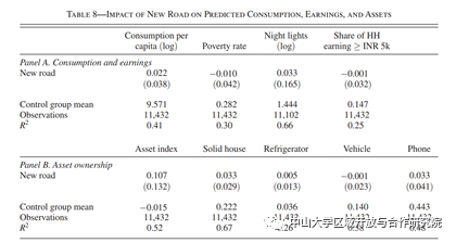 最后,在表8中,文章考察了道路对预期消费,收入和资产的影响,而这些指标是衡量道路是否使人们在乡村生活明显改善可获得的度量单位。