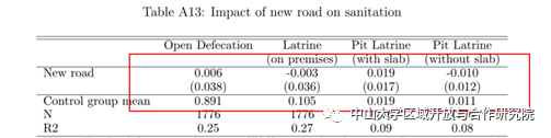 其实最大的威胁来自于,与PMGSY使用相同阈值的其他政策,全面卫生运动(通过厕所修建和宣传减少露天排便),可能会产生影响。表A13对上述结果进行了估计,也未发现会对本文的结果产生影响。