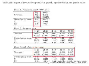 首先, A部分中文章检验了新修道路在2011年对乡村人口数量的影响。人口增长作为一个结果的局限性是,任何的净移徙都可能被生育率和死亡率的变化所抵消,但这种抵消影响会导致村庄人口结构的变化,文章在对数或基数中找不到对总人口产生重大影响的证据。在B部分和C部分中,文章的估计结果显示道路也不会引起人口年龄结构、男性在各年龄结构中比例的变化。