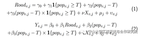 公示2是二阶段主回归,公示1是一阶段回归。Yvj 是本文感兴趣的区域临界组j中村庄v的结果变量,T是达到道路修建标准的村庄人口的临界值,POPvj是村庄人口,Xvj是村庄控制变量(包括村庄便利设施、小学,医疗中心,电气化;农业土地总面积的记录;灌溉的农业土地份额;离最近人口普查城镇的公里数;农业工人比例;识字率;在册种姓比例;拥有农业土地家庭比例;自给农民家庭比例;月收入超过250卢布(4美元)的比例。),ηj和μj都是区域临界值固定效应,是区域固定效应与代表1000临界值的虚拟变量的乘积。ROADvj 是一个虚拟变量,等于1代表村庄V通了公路, β1是作者估计的兴趣参数,度量了新建公路对于结果变量的影响。