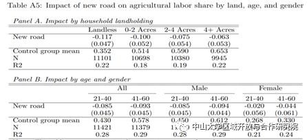 那么是不是会对持有不同土地数量的人产生不同的影响呢。表A5显示了新修道路对不同土地持有规模、年龄、性别的影响。表A5反映出那些没有土地和土地拥有量少的人们显著减少了农业生产活动,其中尤以男性(和年轻人)降幅最大。