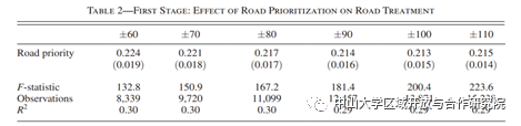 表2是工具变量的一阶段回归结果,起到了与前面的图2一样的作用,支持了临界点是导致村庄是否通路这一外生差异的假设。在选择临界值左右两边60到110人的范围内,皆发现相近的效应,在临界值以上将提升获得修路机会的概率约22个百分点。
