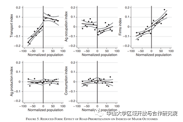 印度的村村通显著提高了交通可获得性,是一个期待之中的结果。而在表3第二栏作者进一步发现道路连通带来的劳动力转移,从事农业活动的职业明显减少。最后三列和三幅图针对工厂就业,农业生产,以及居民消费这三个指标,发现对乡村企业就业的影响比较小,p值=0.09,对其他两项影响非常小而且不显著。图5给出了在断点附近估计的结果图形(这些图显示了控制组和固定效应的残差,阈值两侧的线性估计和95%置信区间)。图5证实了表格的结论,改善交通条件和劳动力转移具有显著性。但是在乡村企业就业、农业生产和消费上影响不显著。