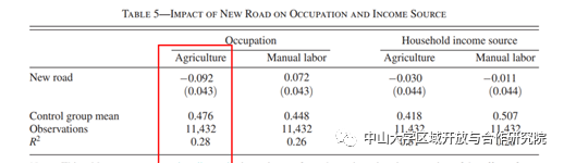 表5:新道路对职业选择的影响。前面我们看到本地的农业从业者显著减少,而本地工厂则未发现明显增加。那么人都去哪了呢?本文进一步分析了就业的去向,研究农业和非农就业的变化,结果如下表5。
