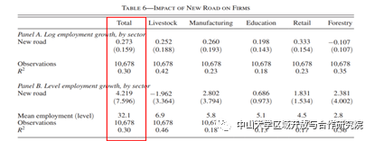 再来看农村工厂,作者从对数和基数两个层面进行了回归分析,表6显示了新建道路对村内乡村企业的就业的估计结果。