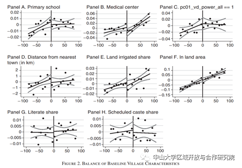 图2显示了实验组和对照组的平衡性检测的结果。首先在修路标准临界值两边的村庄的一系列控制变量是连续变化的,包括村庄的便利设施比如小学和医疗中心,固定效应残差,最近城镇距离,农业灌溉用地,农业总用地,识字率,和种姓居民比例。