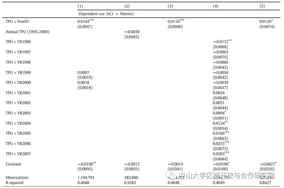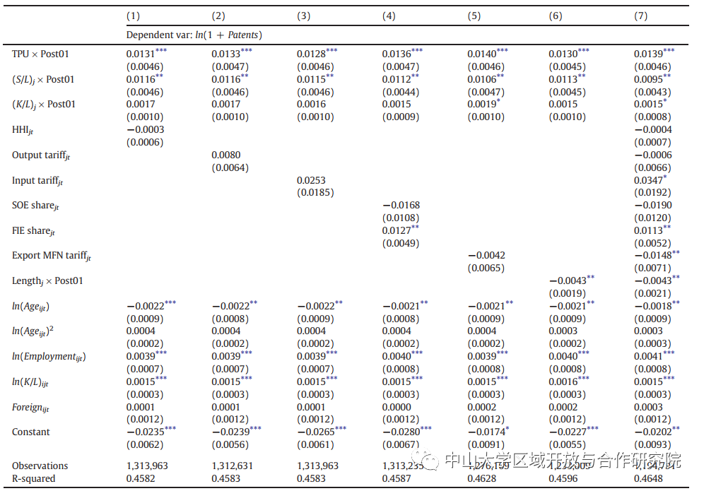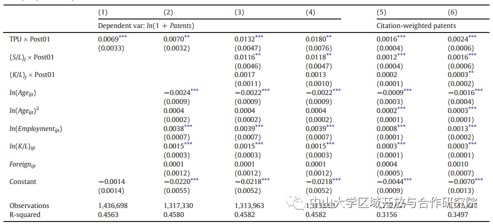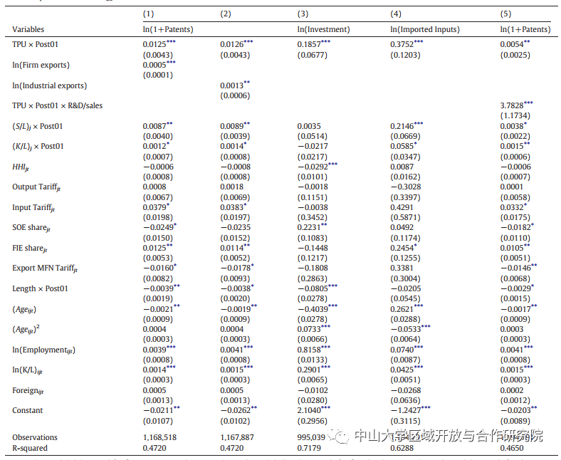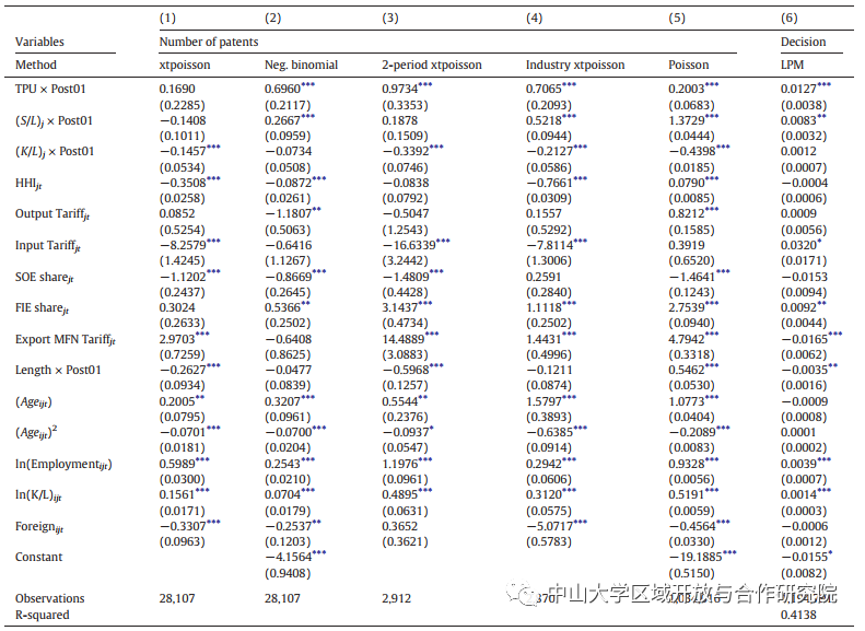 第(1)列使用企业级固定效应泊松回归,而第(2)列使用企业级固定效应负二项回归,具有企业和年份固定效应。第(3)列将样本分为WTO前和WTO后两个时期,并使用企业和时期固定效应进行企业层面的固定效应泊松回归。第(4)列使用具有4位数行业和年份固定效应的行业级固定效应泊松回归分析行业级发明专利。第(5)列在公司层面上运行泊松回归,以2位数的行业年固定效应控制任何行业特定趋势。第(6)列运行一个线性概率模型(LPM),以检查TPU减少对专利申请可能性的影响,以及公司和年份固定效应,标准误差聚集在4位数CIC行业水平上。贸易政策不确定性(TPU)的测量遵循Handley和Limão(2017)的规定。