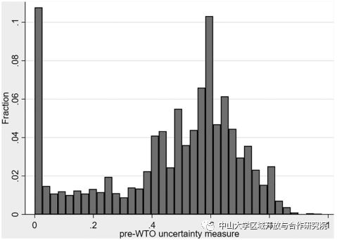 图2:中国加入WTO之前,所有6位数HS产品类别的贸易政策不确定性(TPU)分布情况。TPU按照Handley和Limão(2017)的规定,使用第2列电价进行计量。