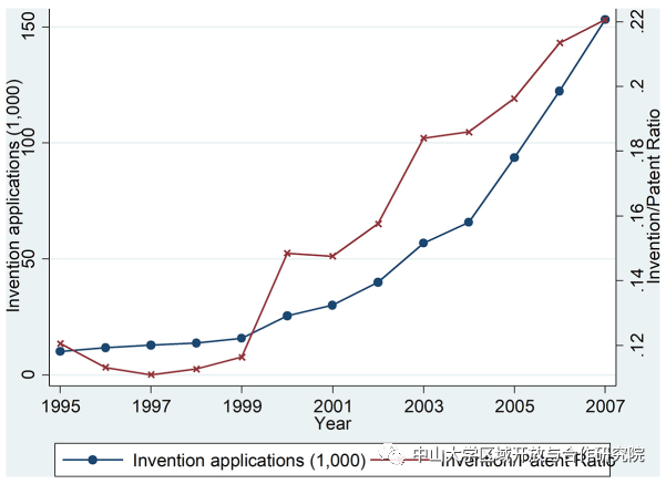 图4:中国发明专利申请数量的增长(左轴,单位为1000)以及发明专利占申请总数的比例