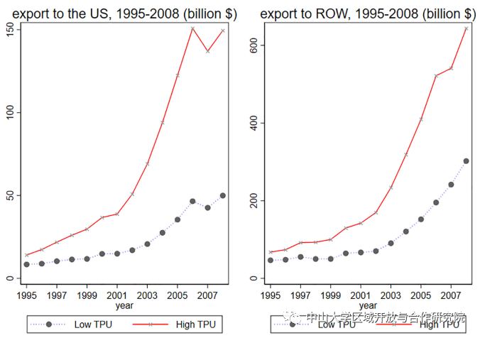 图3:中国加入WTO前的高TPU产品类别相对于低TPU产品类别的出口增长。