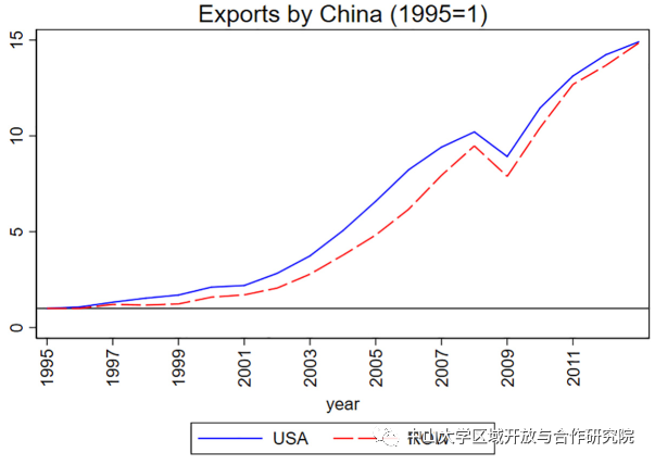 图1:中国对美国和世界其他地方(ROW)的出口在2001年后异常增长