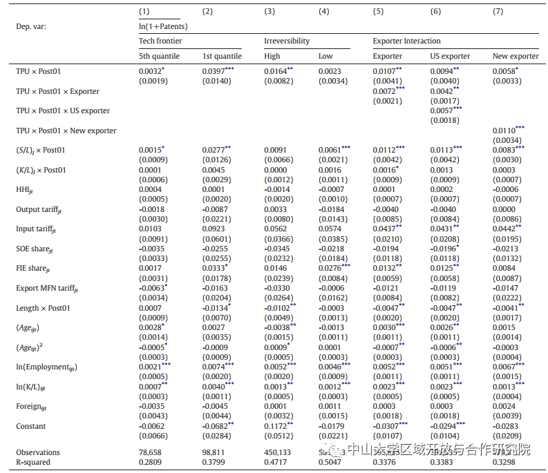 在表7的第(1)-(2)列中,本文检验了已实现的出口增长(由于TPU减少)是否能够完全解释创新激增。表7的第(3)列至第(5)列侧重于三个主要进口。