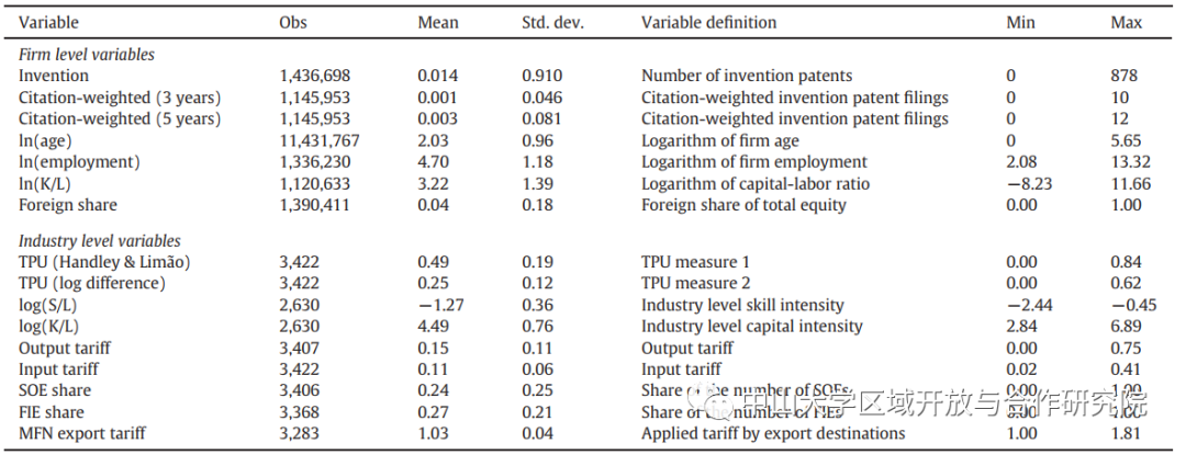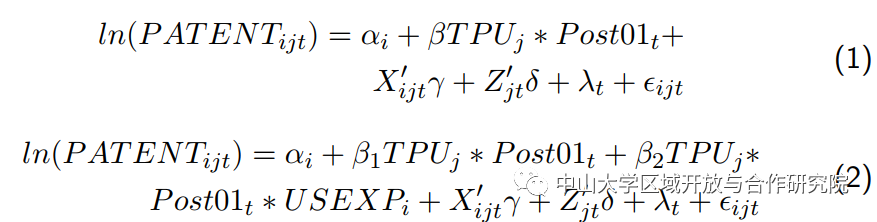 因变量是企业i在第t年在第j产业中的创新活动。TPUj衡量加入WTO前j行业面临的TPU。Post01t表示后WTO时期,从2001年起的年份取1,否则取0。αi是企业固定效应,控制恒定不变的企业特征,还控制不随时间变化但可能影响行业创新倾向的行业和地区差异。如果创新和减少不确定性都与商业周期或其他常见冲击有关,我们的估计就会有偏差。因此,我们添加了一个年份虚拟变量λt。我们还包括一组企业层面变量(Xijt)和一组可能影响创新的行业层面变量(Zjt)。ϵijt是误差项。