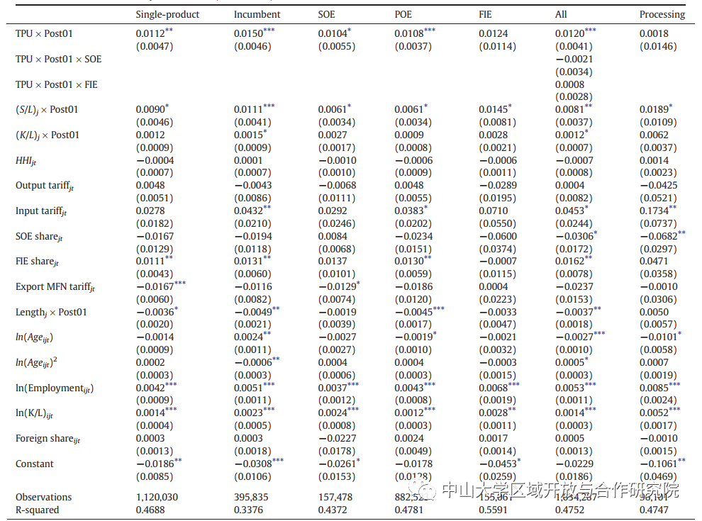 注:所有回归包括年度模型和公司特定固定效应。括号中的稳健标准错误,集中在4位CIC行业级别。贸易政策不确定性(TPU)的测量遵循Handley和Limão(2017)的规定。(K/L)j和(S/L)j是部门级资本密集度(对数)和技能密集度(对数),使用美国NBER-CES生产率数据集测量。公司层面的控制来自中国工业生产年度调查(ASIP)。