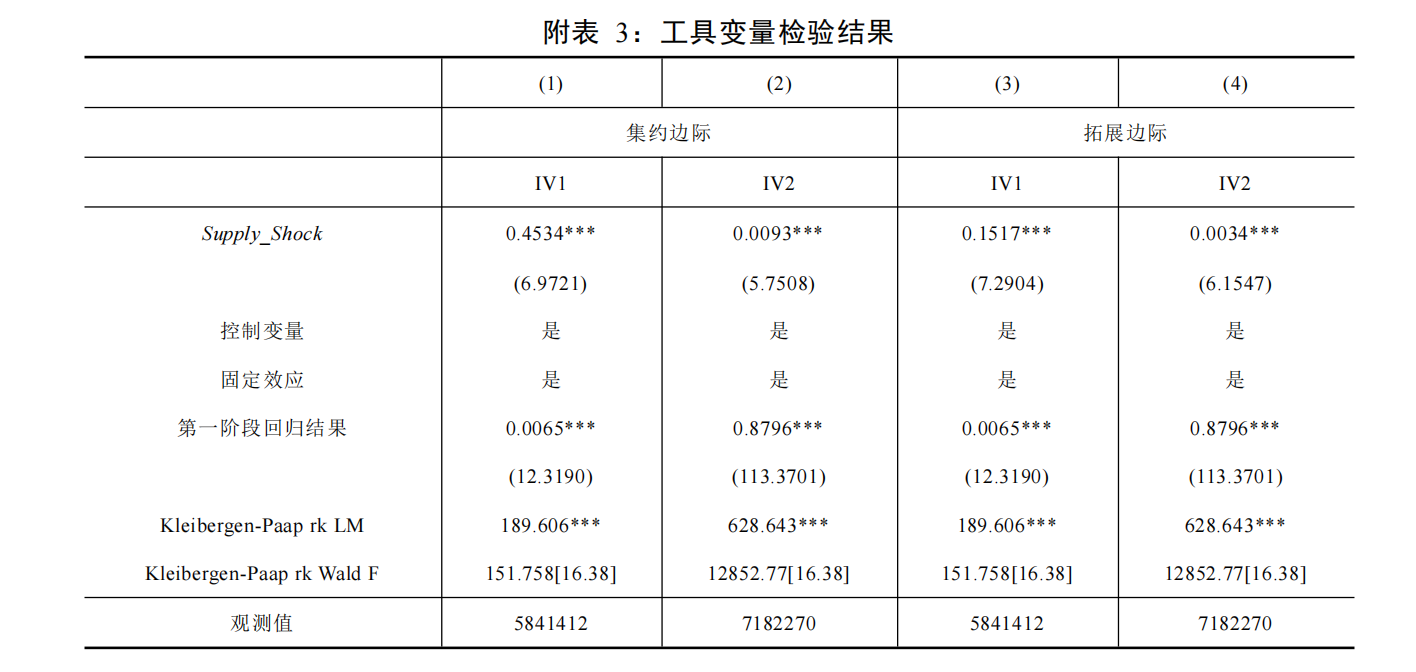 内生性问题:工具变量法。IV1:海外市场接近度乘以国际原油价格。将海外市场接近度(各城市到最近港口距离的倒数乘以100)乘以国际原油价格构造城市层面的时变变量。IV2:城市面临的中国主要进口伙伴中间品出口下降导致的供应链风险。