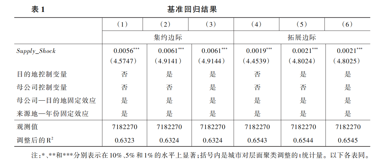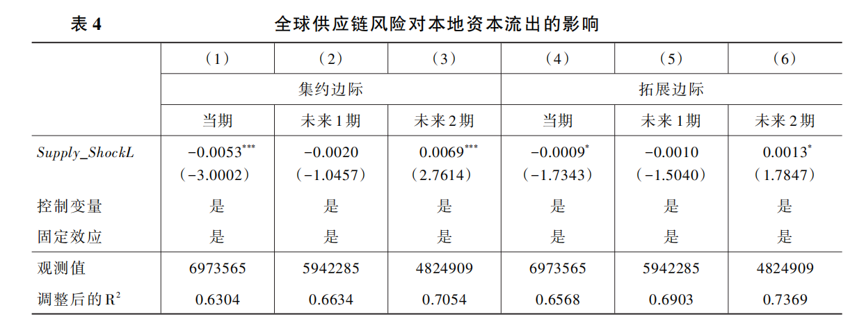 本文将全球供应链风险定位于投资来源地(母公司所在城市)层面,将来源地母公司前往异地设立的子公司数量和概率作为被解释变量,对本地的全球供应链风险敞口(Supply_ShockL)进行回归,即从资本流出的视角检验全球供应链风险的影响。