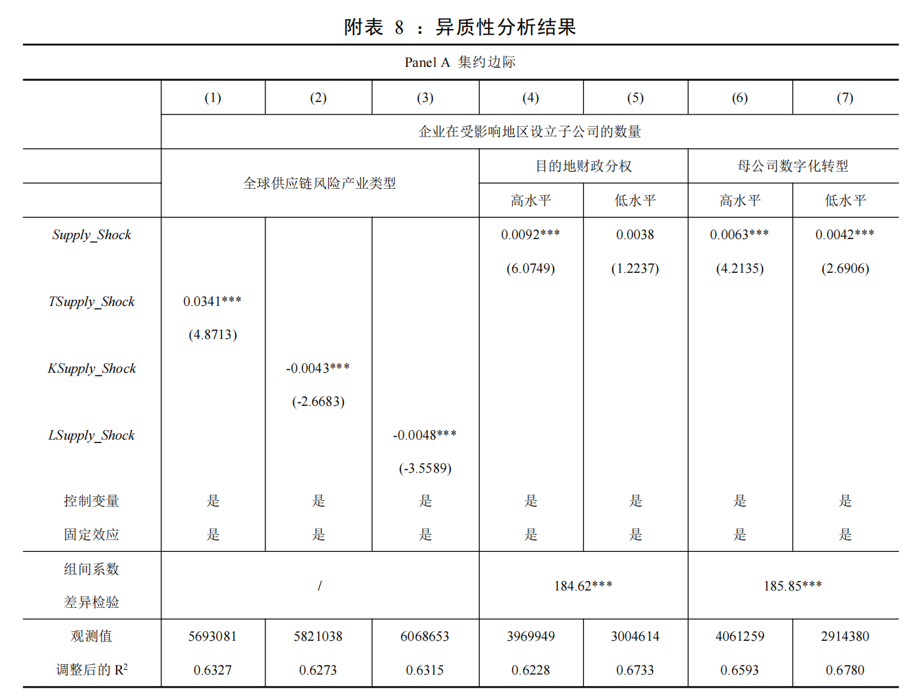 基准回归:(3)、(6)列最严格的模型设定中,核心解释变量的系数和量级未发生明显变化;从系数看,在其他条件不变时,城市面临的全球供应链风险每上升1单位,平均意义上将吸引每家异地母公司在此地设立子公司约0.006家,相当于样本均值的20.54%,每家异地母公司在受全球供应链风险影响城市设立子公司的概率平均增加0.21个百分点。全球供应链风险对国内资本产生了空间再配置效应,对国内资本跨区域流动具有显著正外部性。