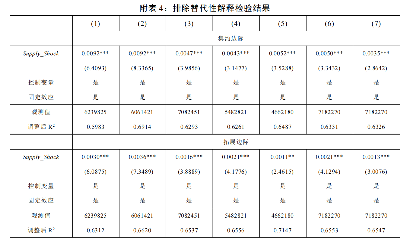 解释变量:Supply_Shock1:本文利用CEPII—BACI数据库,构建以中间品为标的的城市—年份层面全球供应链风险指标。具体做法如下:①将HS编码统一至HS02版本,将其与BEC分类标准匹配后识别出可贸易中间品;②将中间品的HS编码与CIC4位码相匹配,计算每年全球每个行业中间品对除中国之外的经济体出口,相较于上一年的下降程度;③利用不同国家和地区中间品出口下降幅度,结合中国海关数据库中各城市在期初分来源地的行业中间品进口份额,构造类似于Bartik式变量,将行业层面的全球供应链风险转化至城市层面,以衡量目的地的全球供应链风险敞口。Supply_Shock2:以地级市期初特定行业吸纳劳动力数量占比替换进口权重。